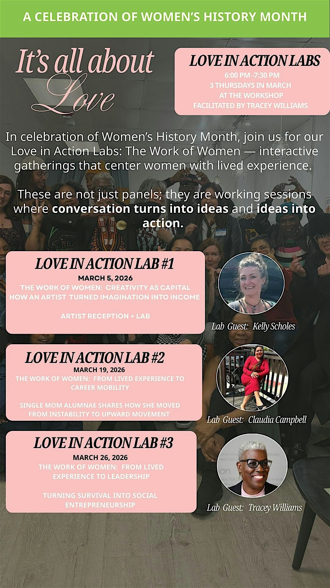 Guest Speakers will share their experiences and wisdom and attendees will work on ideas in real-time.To celebrate Women’s History Month, uu will host Love in Action Labs: The Work of Women, offering interactive gatherings that center women with lived experience.
