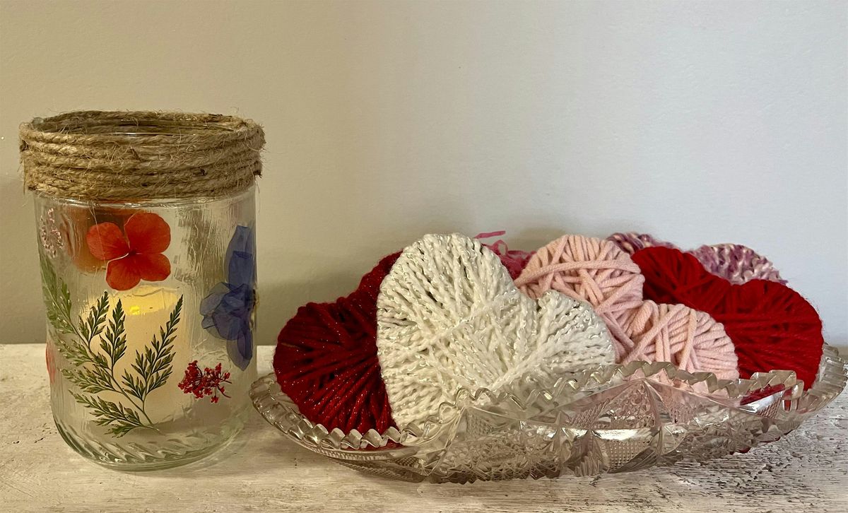 Design a one-of-a-kind floral jar —perfect for holding a candle, flowers, or simply as décor. You’ll also craft whimsical yarn-wrapped hearts and choose a glass dish to style them in, creating a sweet handmade piece to keep or gift.