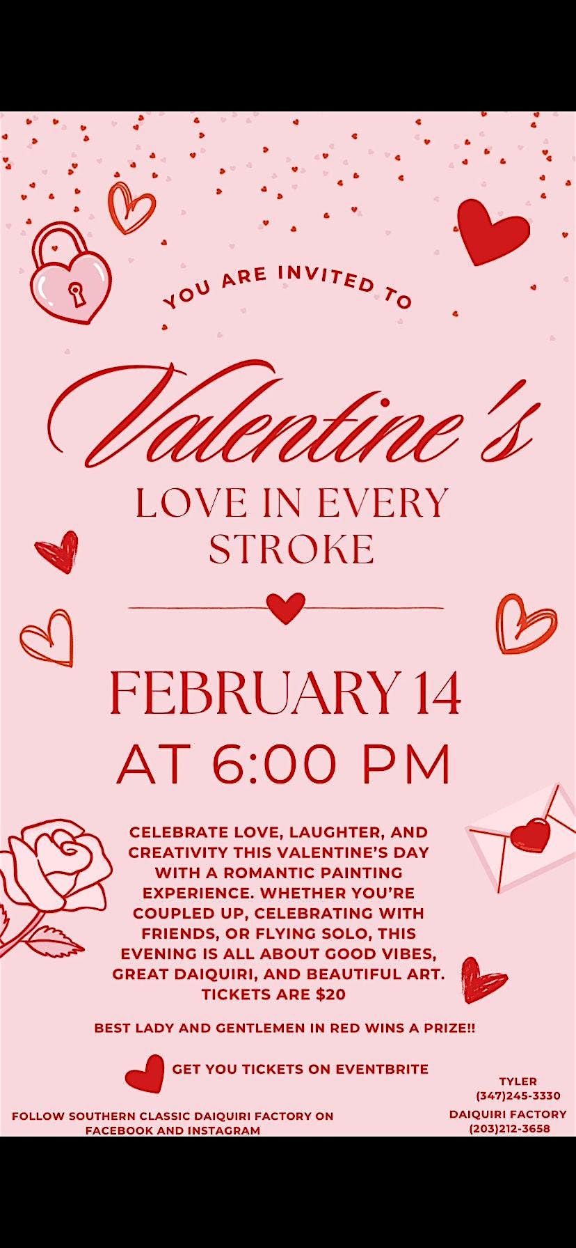 Celebrate love, laughter, and creativity this Valentine’s Day with a romantic Sip & Paint experience. Whether you’re coupled up, celebrating with friends, or flying solo, this evening is all about good vibes, great daiquiri, and beautiful art.