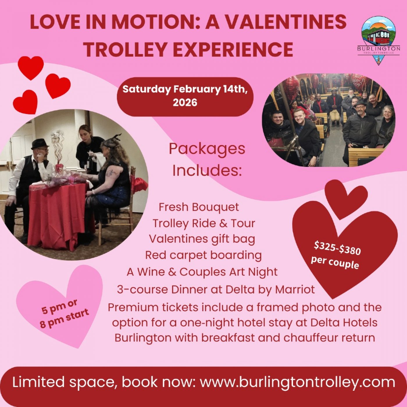 Step onto a red carpet and climb aboard a beautifully decorated trolley for an evening of charm, romantic throwbacks, and curated moments designed just for two. With romantic music, a professional photographer, and optional upgrades that add luxury, comfort, and unforgettable keepsakes, this is the perfect way to make your Valentine’s Day feel truly special.
