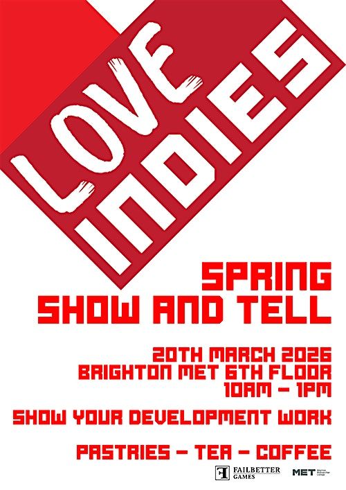 If you could use some informed player feedback, casual playtesting, presentation practice, or just to talk to other people about your game in a low-stress environment, come down to the fourth Love Indies showcase at Brighton MET!