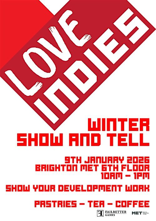 If you could use some informed player feedback, casual playtesting, presentation practice, or just to talk to other people about your game in a low-stress environment, come down to the fourth Love Indies showcase at Brighton MET!