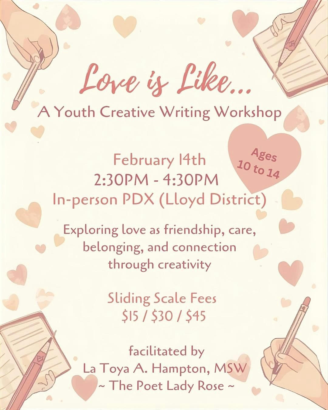 Love Is Like… is an in-person Valentine’s Day creative writing workshop for youth in Portland, inviting young people to explore what love feels like through imagination, sensory language, and self-expression.