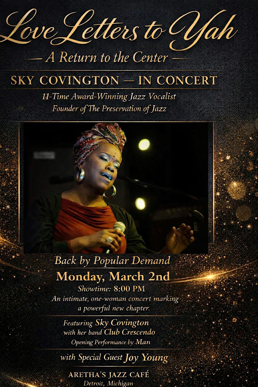 In celebration of Women’s History Month, Detroit jazz icon Sky Covington returns to the stage with extraordinary depth, presence, and purpose in Love Letters to Yah: A Return to the Center — an intimate concert experience that places her voice, faith, and artistry at the forefront.
