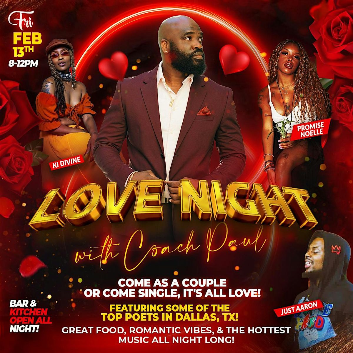 Welcome to Love Night! Join us at 2000 Esters Rd suite 208 on February 13, 2026 at 8:00 PM (Central time) for a romantic evening filled with love, laughter and poetry. Let's celebrate love in all its forms together. See you there!
