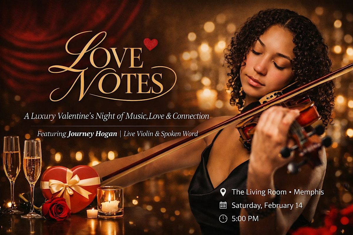 Love Notes is a beautifully curated Valentine’s experience for both couples and singles featuring soulful live violin by Memphis’ own Journey Hogan, powerful spoken word, two Living Room Signature Sips (premium handcrafted, spirit-free cocktails) per guests,and a warm, romantic upscale atmosphere.