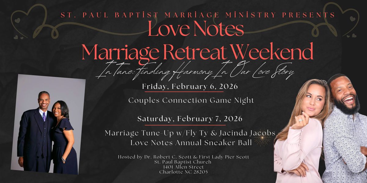 The St. Paul Marriage Ministry is excited to announce our Love Notes Annual Marriage Retreat, taking place February 6th through February 7th, 2026, on campus in the Ray of Hope for your convenience. This year’s theme is “In Tune: Finding Harmony in Our Love Story.” We are honored to welcome retreat facilitators Radio Personality Derrick “Fly Ty” Jacobs and his wife Jacinda Jacobs from the FlyTy and Jacinda Show on V101.9 FM right here in Charlotte.