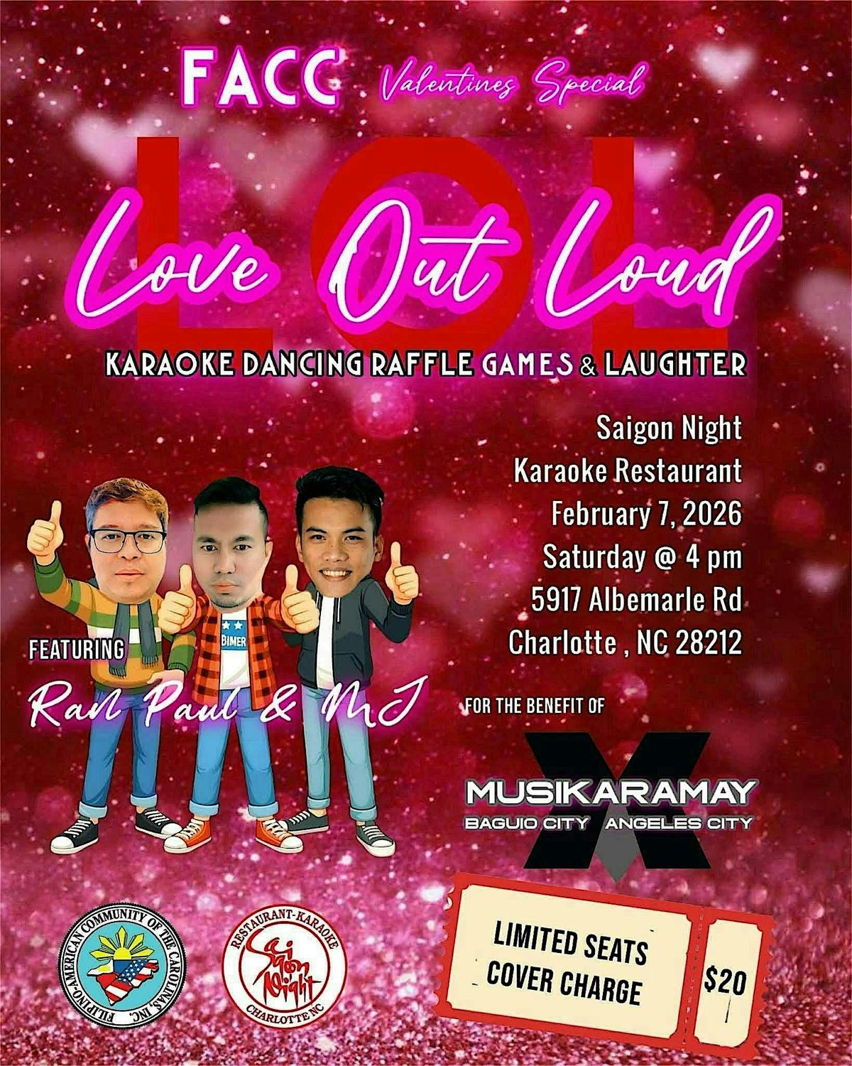 The Filipino American Community of the Carolinas (FACC) will hold its first fundraiser event for 2026 with LOL: Love Out Loud, a pre-Valentine celebration of comedy, dancing and lots of karaoke singing! The FACC has partnered with Musikaramay (two Filipino words Musika + Karamay, when combined translates to companion or to help), a Filipino non-profit organization which had its origins from civic-minded individuals busking around the metro and donating the earnings to struggling street musicians. The organization has evolved to helping different marginalized sectors or giving financial assistance to different foundations. The LOL event will benefit a four year-old quadriplegic, blind and mute girl needing medical assistance. FACC, a registered 501(c)(3) non-profit organization, has been serving the Filipino American community in the region and bridging them to other communities for more than thirty years. This is a limited seats event and FACC would like to request attendees to reach out to [email protected] to be counted.