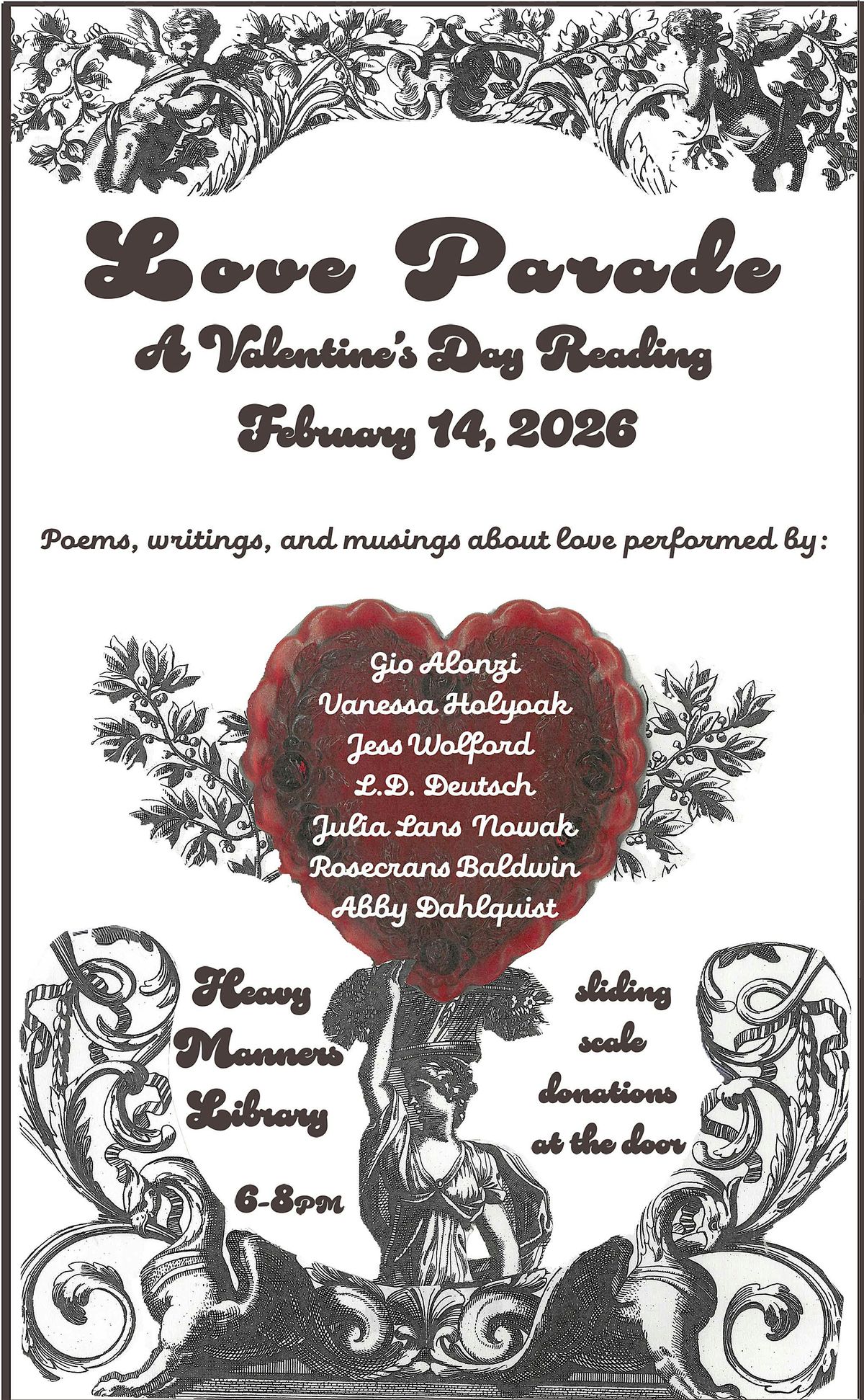 It's ok to feel your feelings this Valentine’s Day. Join the love parade at Heavy Manners Library on 2/14 from 6-8pm for a night of poetry and other musings on love from members of LA's music and literary communities: Rosecrans Baldwin. Jess Wolford, L.D. Deutsch, Gio Alonzi, Vanessa Holyoak, Julia Lans, Nowak, and Abby Dalhquist. Drinks to be provided during the event.