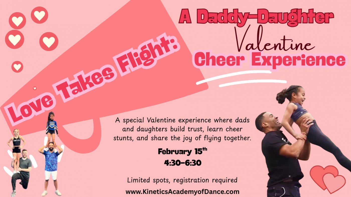 This Valentine’s Day, celebrate love, trust, and teamwork during a truly special Daddy–Daughter cheer experience. Designed for all experience levels, this heart-filled event brings dads and daughters together through the joy of cheerleading while learning safe and proper ways to stunt at home.