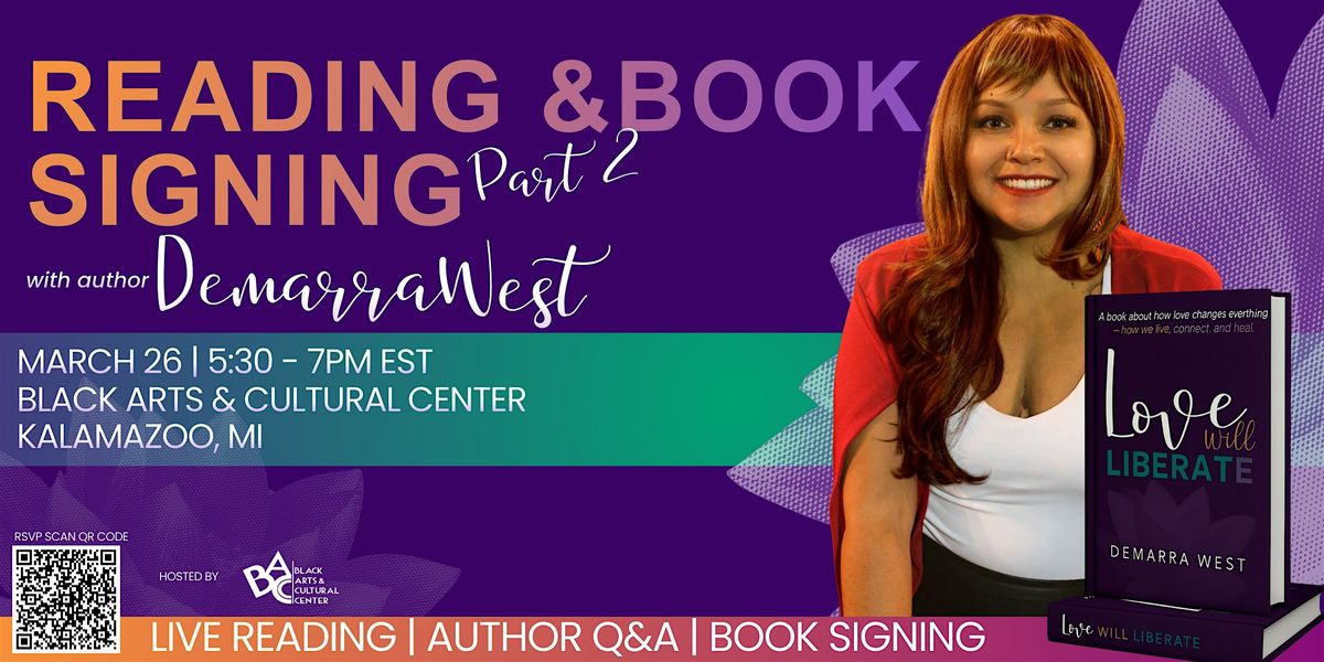 Join author Demarra West on March 26, 2026 from 5:30 to 7 pm at the Black Arts and Cultural Center in Kalamazoo, Michigan for a book reading and signing for her newly released book Love Will Liberate, hosted by the Black Arts and Cultural Center. In addition to the reading and signing, the evening includes an author Q and A and time to connect and celebrate the book release.