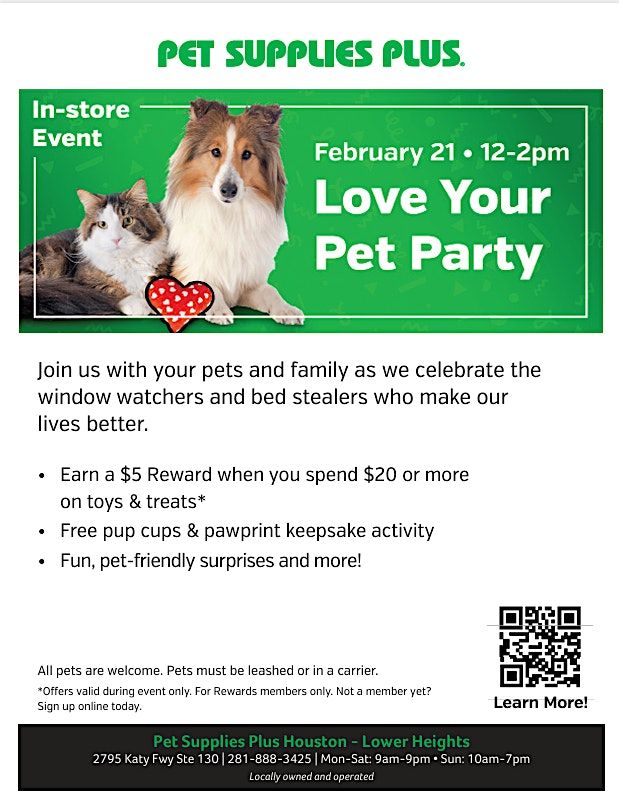 Welcome to the Love Your Pet Party happening at Pet Supplies Plus Houston - Lower Heights on February 21, 2026 at 12:00 PM (Central Time)! đž