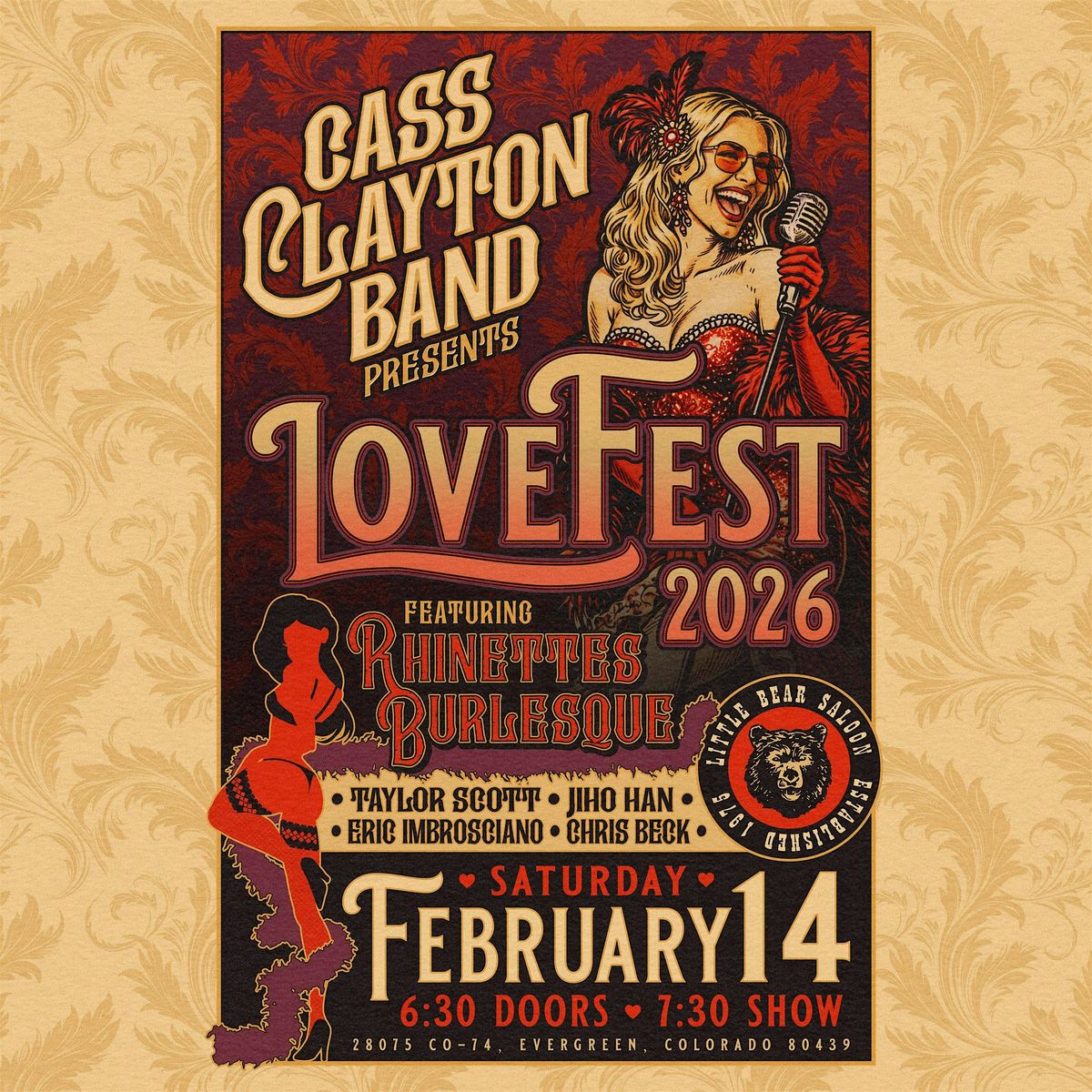 Presented by the Cass Clayton Band, LoveFest delivers a high-energy night of soulful live music paired with the sultry artistry of Rhinette’s Burlesque. Expect bold performances, captivating vocals, and an electric atmosphere designed to keep the night flowing from start to finish.