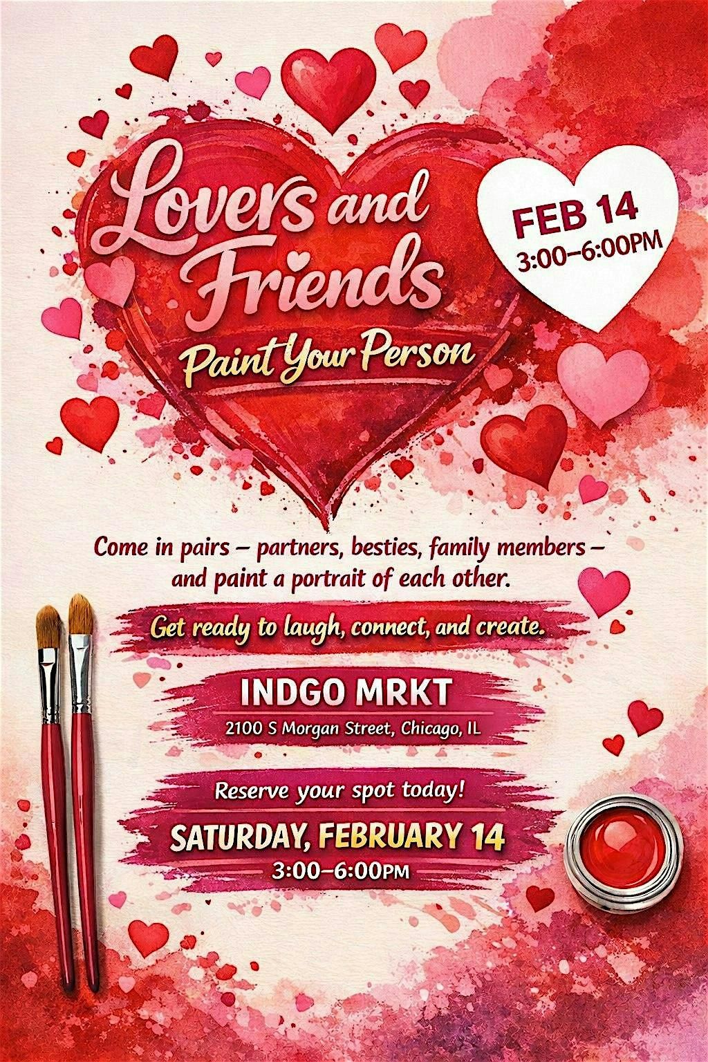 This is an evening for lovers and friends. Make it a date night, girls' night, or family gathering. Paint portraits of one another for some fun laughs. Email a photo for a pre-sketched canvas for an additional charge.