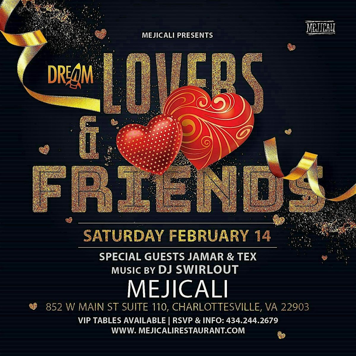 Mejicali presents a Lovers & Friends Valentine's Day Affair. Music by DJ Swirlout. Special guests Jamar & Tex. VIP tables available.