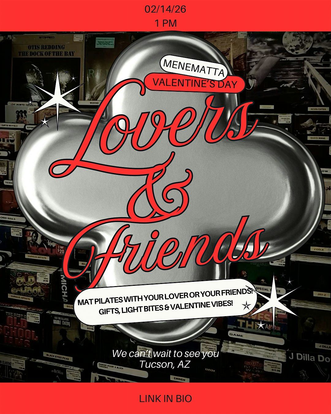 The event begins at 1:00 PM and includes light bites and refreshments, making it the perfect way to move, vibe, and unwind together on Valentine's Day.