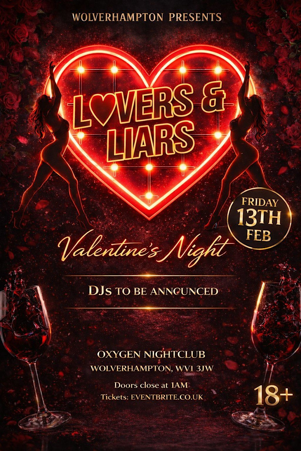"Lovers & Liars" promises to be an unforgettable Valentine's night celebration in Wolverhampton, hosted by DCEVENTZ X ACTIVE CREW at the Oxygen Nightclub on Friday, February 13th. This 18+ event guarantees an amazing night filled with excitement and entertainment. Doors close at 1 AM, so be sure to arrive early and not miss out on the fun. Tickets are available on EVENTBRITE.CO.UK, and you definitely don't want to miss the chance to be part of this incredible experience. Get your tickets now!