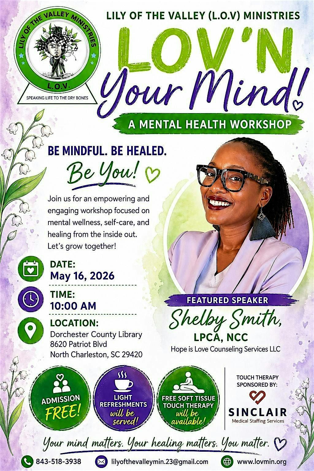 Join Lily of the Valley (L.O.V.) Ministries for LOV ’N Your Mind, an uplifting and empowering Mental Health Workshop designed to nourish your mind, body, and spirit. This free community event will feature special guest speaker Shelby Smith, LPCA, NCC of Hope is Love Counseling Services LLC, who will share practical tools for mental wellness, self-care, healing, and emotional resilience.