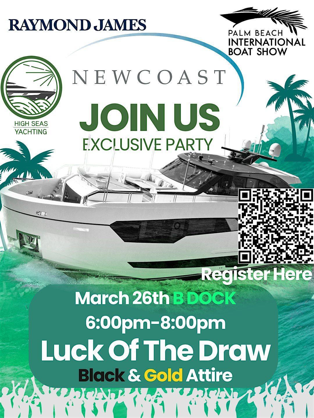 Join Newcoast, Raymond James, and High Seas Yachting for an exclusive βLuck of the Drawβ themed evening during the Palm Beach International Boat Show.