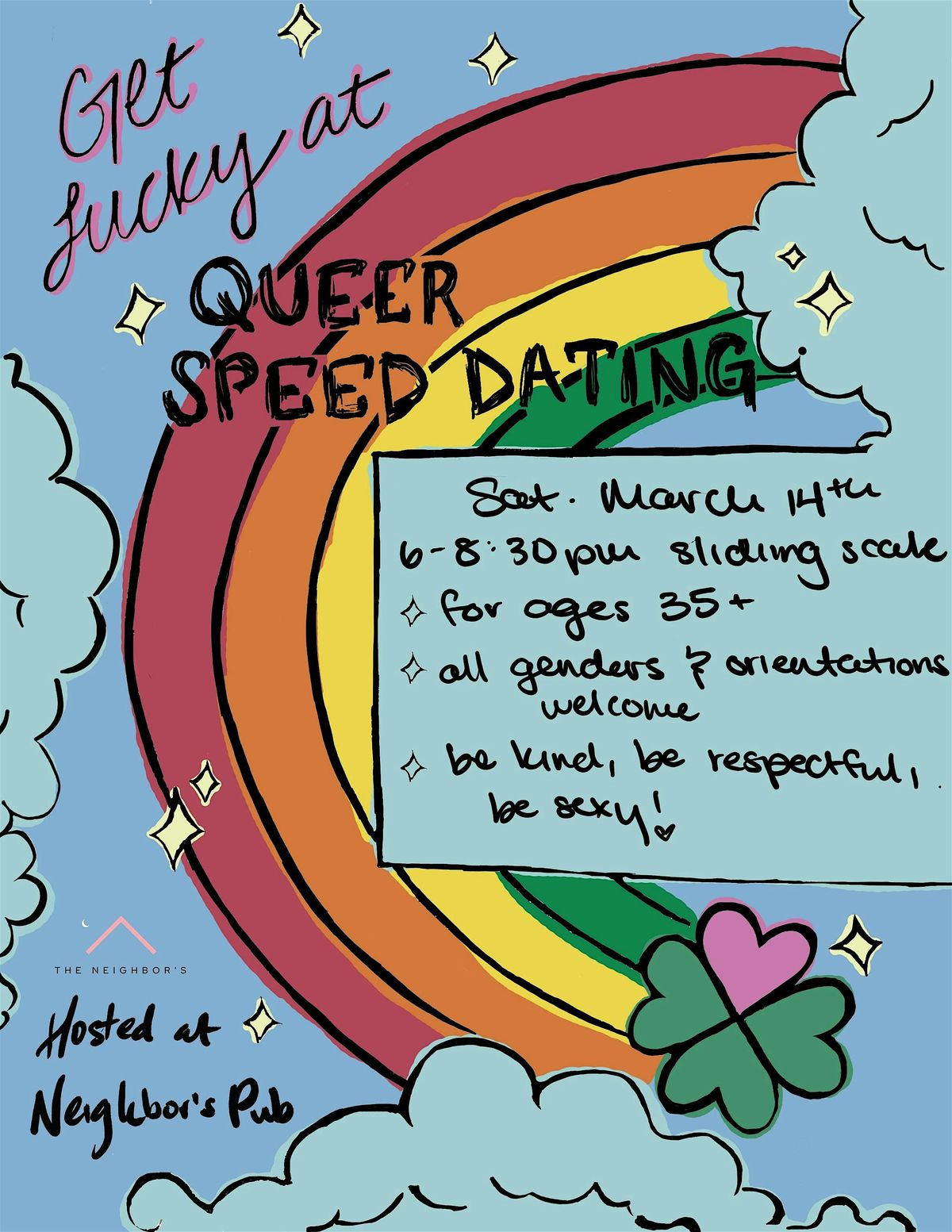 Come get lucky in love! Skip the apps and find your pot of gold at the end of the rainbow! Join us at Neighbor's Pub for a night of queer flirtation and drinks (nonalc available for all our sober cuties) 💚