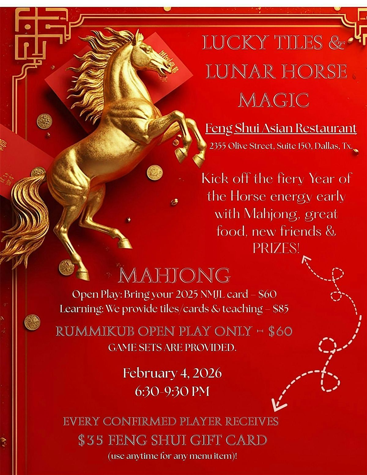 Welcome to Lucky Tiles and Lunar Horse Magic happening at Feng Shui Fine Asian Cuisine on February 4, 2026 at 6:30 PM (Central Time)! Get ready for a night filled with good vibes and positive energy. Join us for a fun evening of delicious food, great company, and exciting activities. Let's celebrate the Lunar New Year together in style! Don't miss out on this special event that promises to bring luck and joy your way.