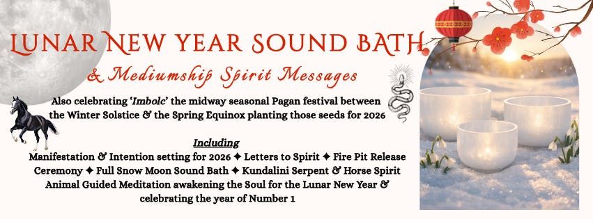 Mediumship Spirit Messages, Guided Meditation, Quartz Crystal Sound Bath, Fire Ceremony & Kundalini Activation as we welcome in the Lunar New Year of 2026 and the transition from the Wood Snake spirit animal to the Fire Horse spirit.