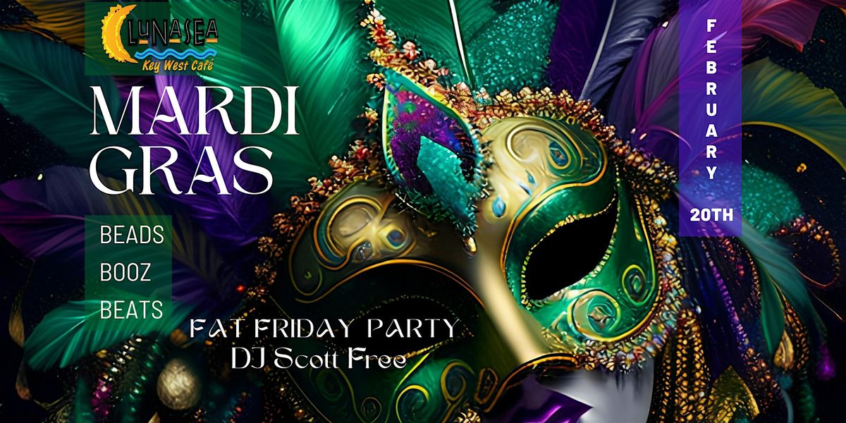 Welcome to LunaSea for a celebration of one of the sexiest and savory events of the year. Let you alter ego free as you dress mysteriously with mask, beads, and Mardi Gras costumes. Enjoy a creative experience with our on site Face Painting expert. Get ready for a vibrant explosion of purple, green and gold as LunaSea transforms itself for this Louisiana Celebration at our Mardi Gras "Fat Friday Party" featuring Live Jazz and Creole Cuisine. Honoring Fat Tuesday to the highest degree LunaSea's "Fat Friday Party" will be full of sights, sounds, smells and taste of New Orleans. Join us on March 20, 2026 at 5:00 PM (Eastern Time) for a special menu to include traditional favorites like Gumbo, Crawfish Boil, Red Beans and Rice just to name a few. Mingle with bead throwing locals as they sip on Hurricanes, Carnival Crushs and King Cake Shoots. Dance to the your delight with DJ Scott Free for this chaotic joyful community gathering. "Laissez les bons temps rouler" Cajun French pharse translates to "Let the good times Roll"!