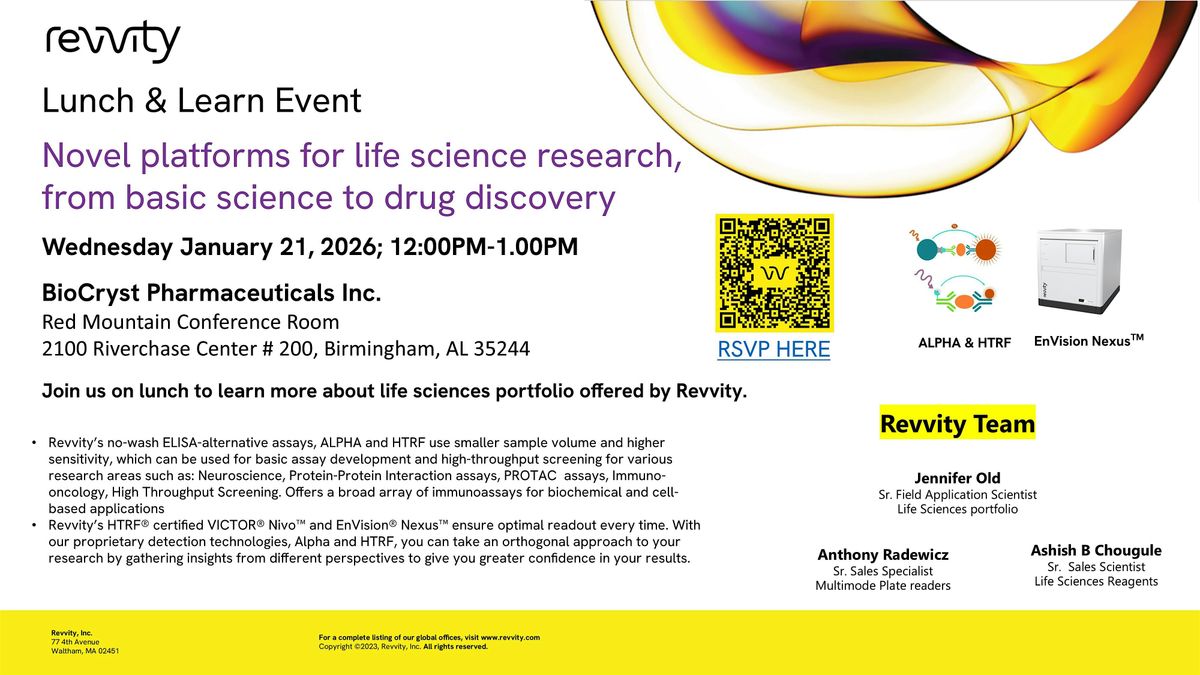 Revvity (previously affiliated with PerkinElmer, Inc.) is a visionary partner in developing technologies and solutions to help solve the world’s greatest health challenges. Revvity offers wide range of technologies and instrumentation such as drug discovery reagents, microplate readers, automated cell counters, in vivo imaging etc for different life sciences research fields. In this Lunch and Learn event, Revvity team will be presenting on a topic “Novel platforms for life science research, from basic science to drug discovery.” The presentation will cover following topics