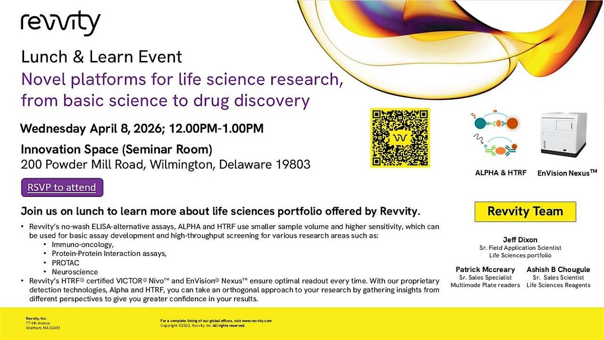 Revvity (previously affiliated with PerkinElmer, Inc.) is a visionary partner in developing technologies and solutions to help solve the world’s greatest health challenges. Revvity offers wide range of technologies and instrumentation such as drug discovery reagents, microplate readers, automated cell counters, in vivo imaging etc for different life sciences research fields. In this Lunch and Learn event, Revvity team will be presenting on a topic “Novel platforms for life science research, from basic science to drug discovery” The presentation will cover following topics