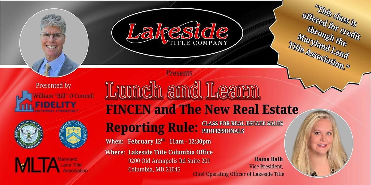 Lunch and Learn: FINCEN and The New Real Estate Reporting Rule. With your instructors Bill O’Connell, Esq. VP and Mid-Atlantic & Underwriting council of FNF Family of Companies.