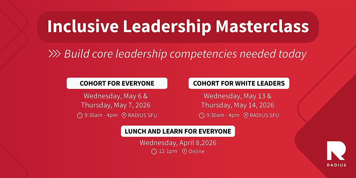 - Inclusive Leadership Masterclass (Cohort for white leaders*) | Wednesday, May 13 and Thursday, May 14, 2026, 9:30 am to 4 pm