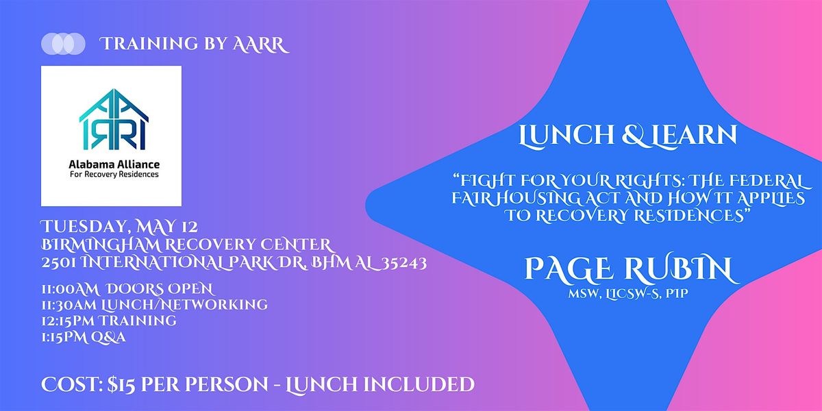 Training from 12:15pm - 1:15pm provided by Page Rubin: "Fight For Your Rights: The Federal Fair Housing Act and How It Applies To Recovery Residences"