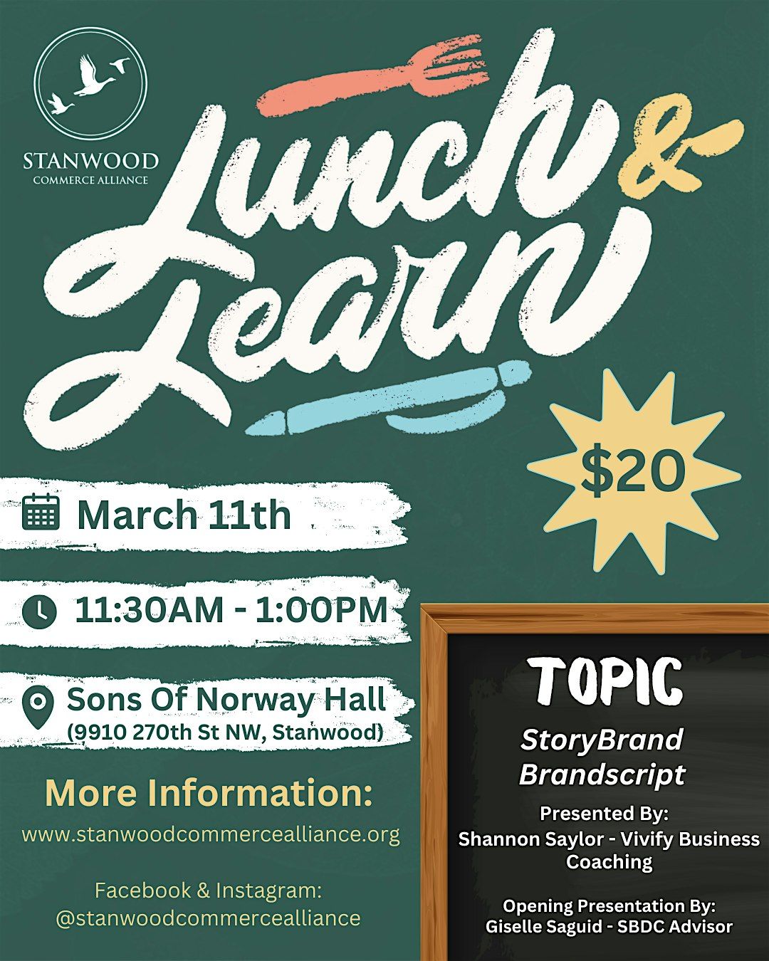 This special Lunch & Learn will feature four Stanwood Commerce Alliance members sharing insights, experiences, and topics they’re passionate about within our business and community landscape. It’s a great opportunity to hear directly from fellow members while connecting with other local professionals.