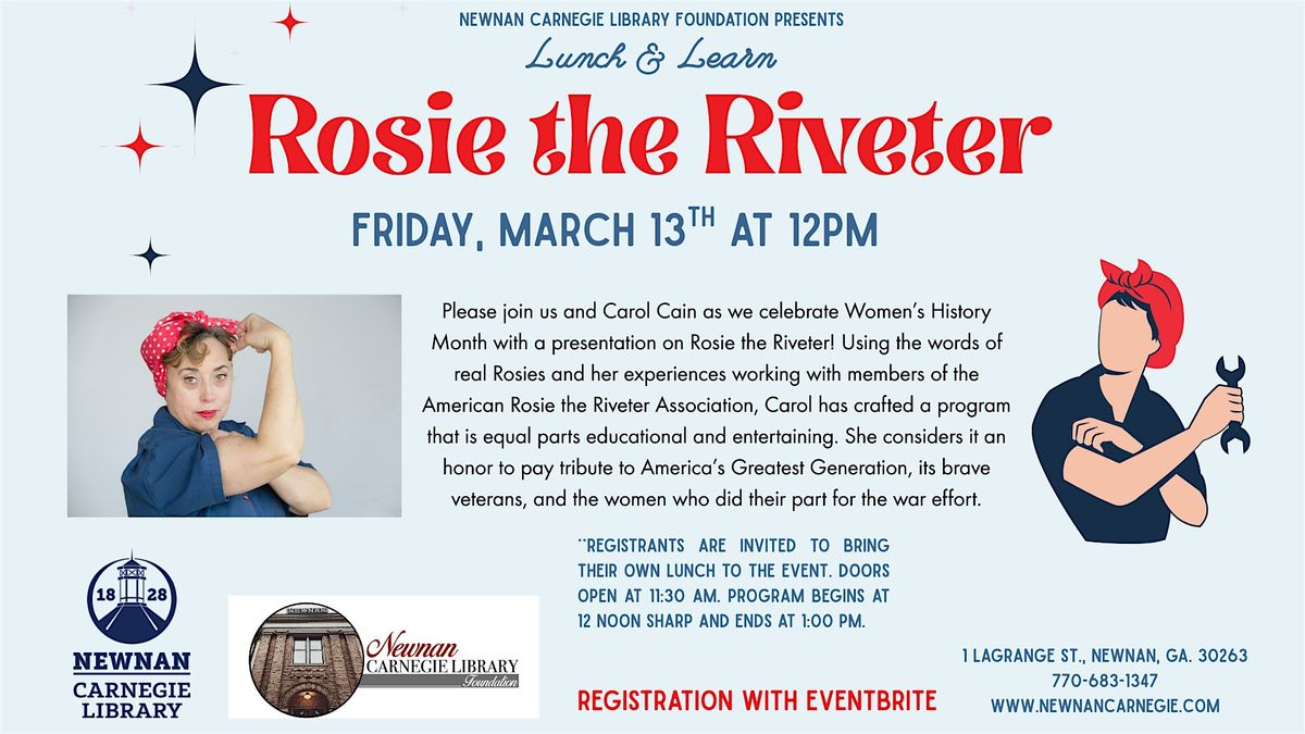 Please join the Carnegie Library and the Newnan Carnegie Library Foundation for a presentation by Carol Cain, educator and storyteller, as we celebrate Women’s History Month with a presentation on Rosie the Riveter! Using the words of real Rosies and her experiences working with members of the American Rosie the Riveter Association, Carol has crafted a program that is equal parts educational and entertaining. She considers it an honor to pay tribute to America’s Greatest Generation, its brave veterans, and the women who did their part for the war effort.