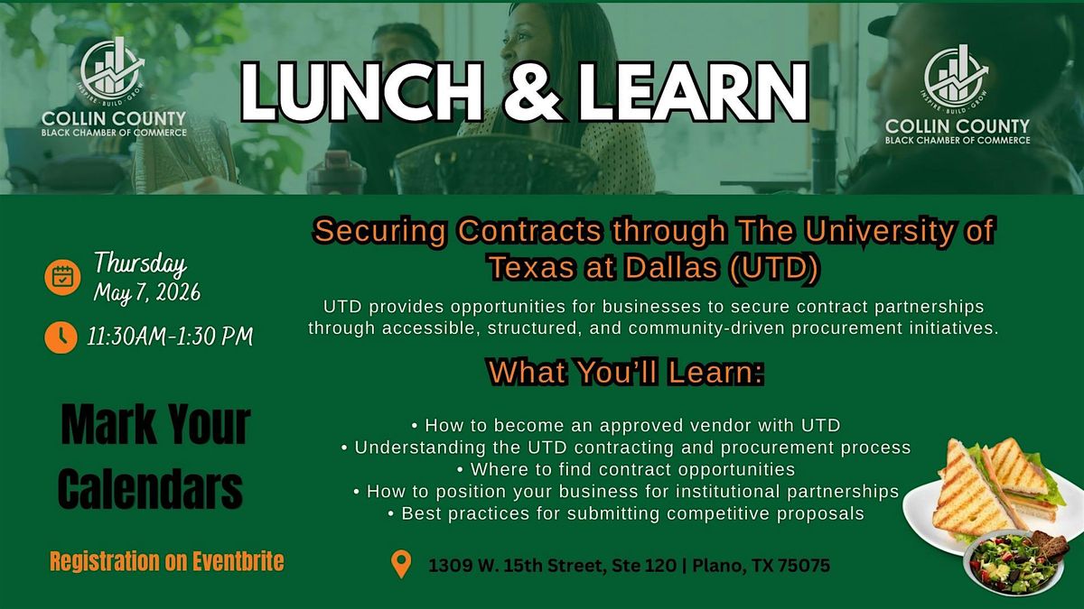 Join us for an informative and engaging Lunch & Learn designed to help business owners navigate opportunities with UTD and position themselves for success in securing contracts.