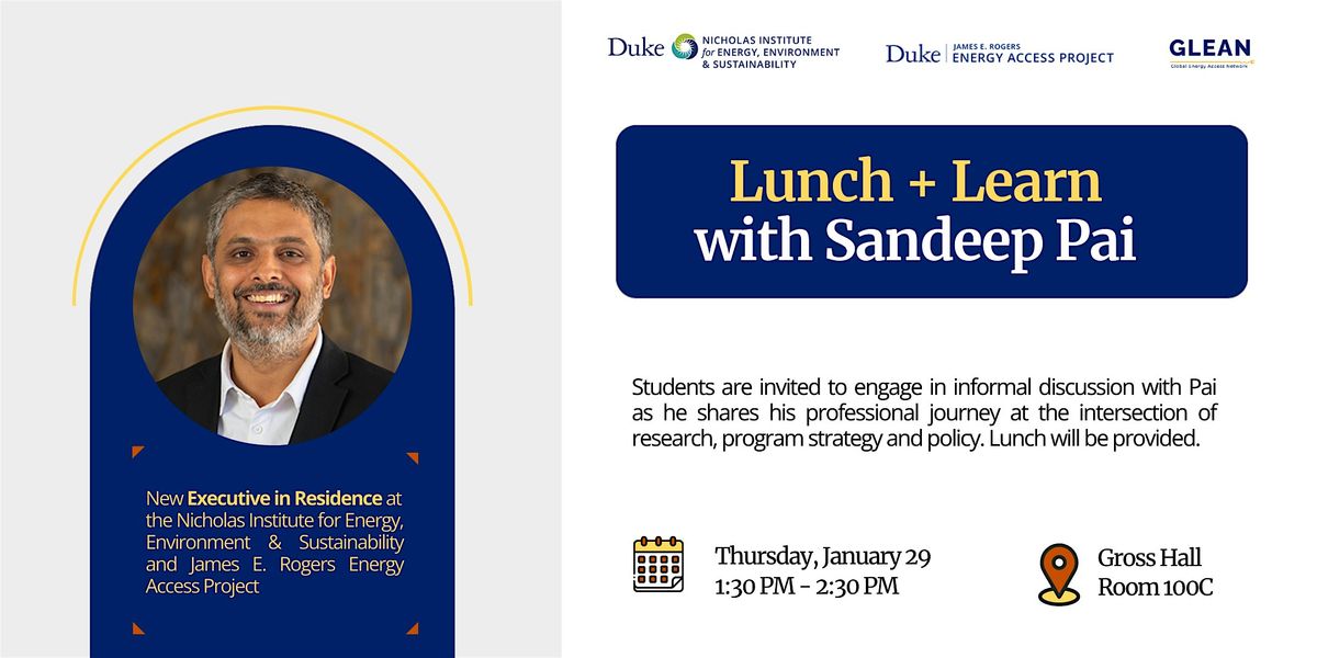 Curious about careers in global energy or policy? Duke students are invited to join us for an informal lunch conversation with Sandeep Pai, Duke’s new executive in residence and senior lead for international energy transitions. He’ll share stories from his journey working with international organizations and chat about what he’ll be doing on campus.