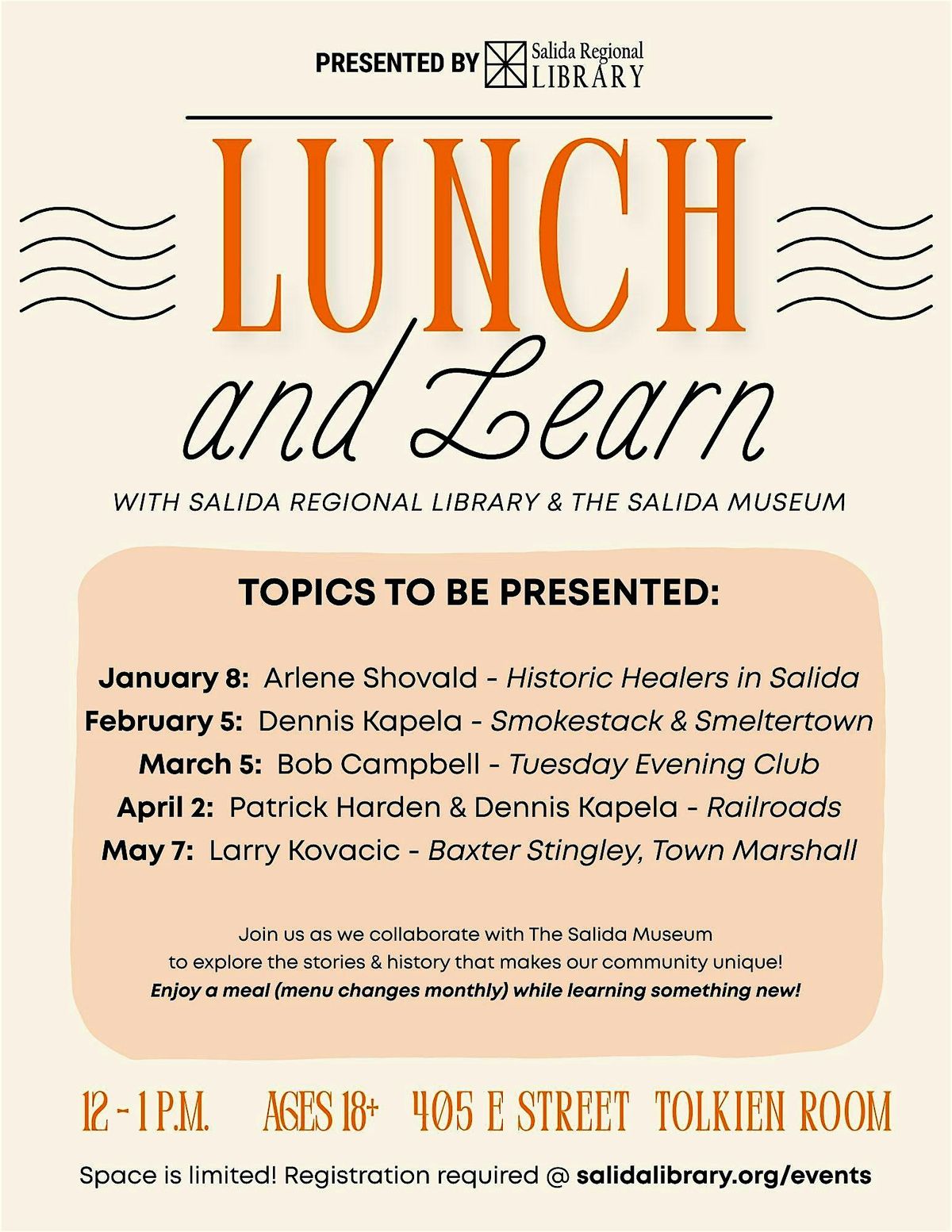 Join us for a free lunch (menu changes monthly) and explore the stories & history that makes Salida unique with local experts.About this Event