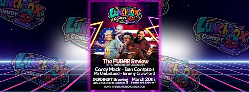 Welcome to Lunchbox Comedy's FUBAR Review: All Veterans Show! Join us at Deadbeat Brewing Co on March 20, 2026 at 7:00 PM for a night of laughter and fun. This special event will feature talented veterans showcasing their comedic skills on stage. Get ready for a night full of jokes, stories, and good vibes. Don't miss out on this unique opportunity to support our veterans and enjoy a great show. See you there!