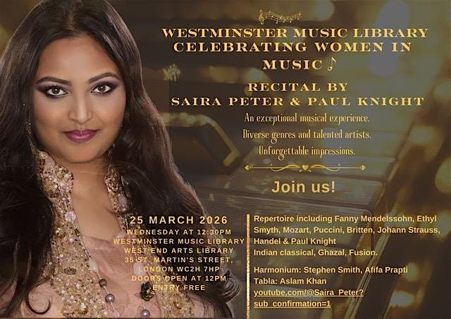 Westminster Music Library welcomes Saira Peter, Paul Knight & ensemble for a free lunchtime concert in a relaxed environment. Admission is free and all are welcome.