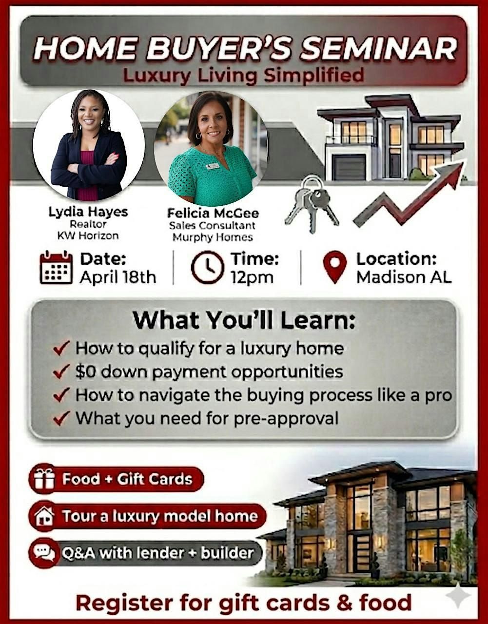 Ready to dive into the world of luxury living? Join us in person for an easygoing seminar where we break down everything you need to know about buying your dream home without the stress. Whether you're a first-timer or upgrading your lifestyle, we've got tips and insider info to make your journey smooth. Come hang out, learn, and get one step closer to your perfect fancy pad!
