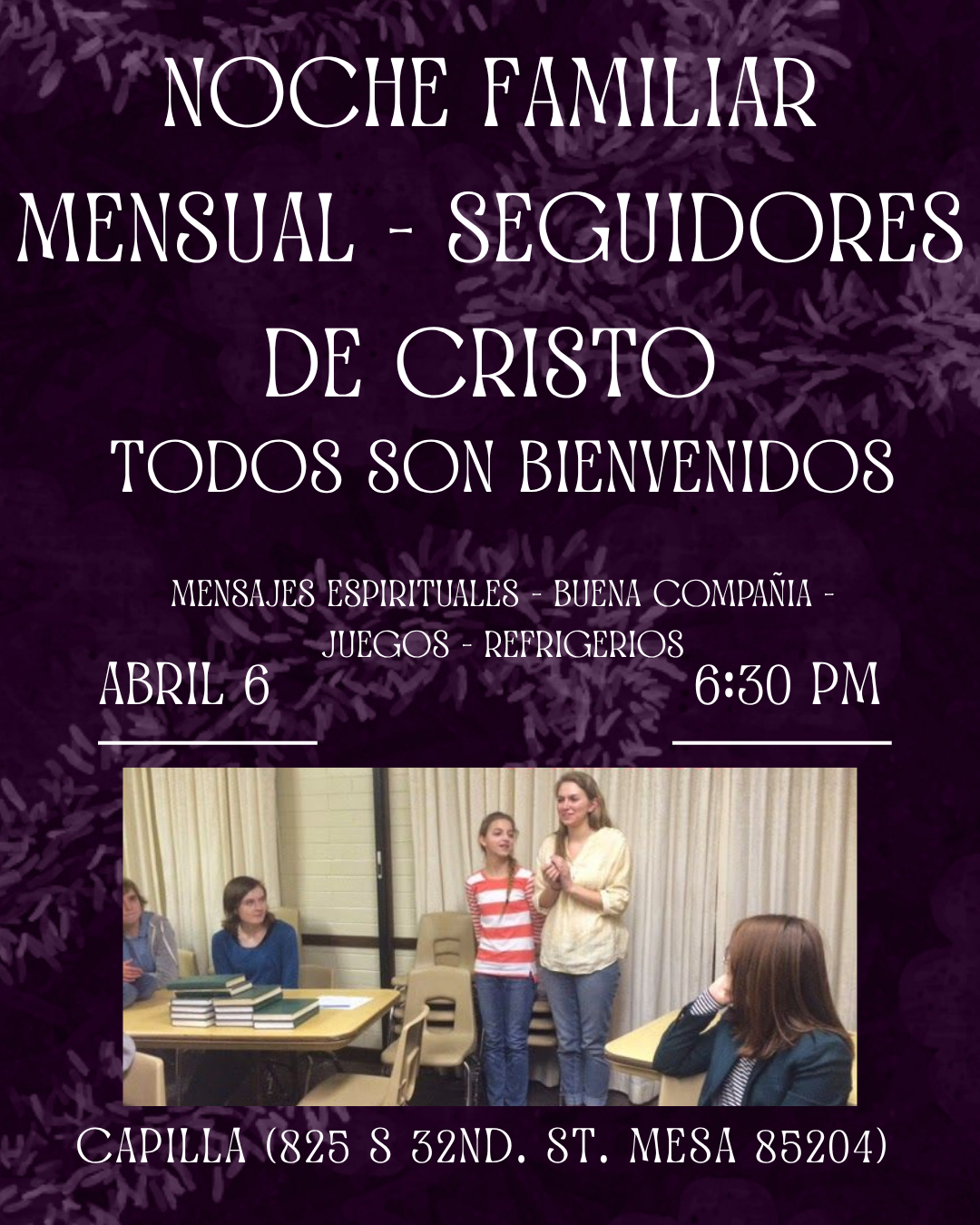 La congregación de Loma Vista branch te invita a una noche especial con mensajes espirituales, juegos y refrigerios. Todos son bienvenidos!