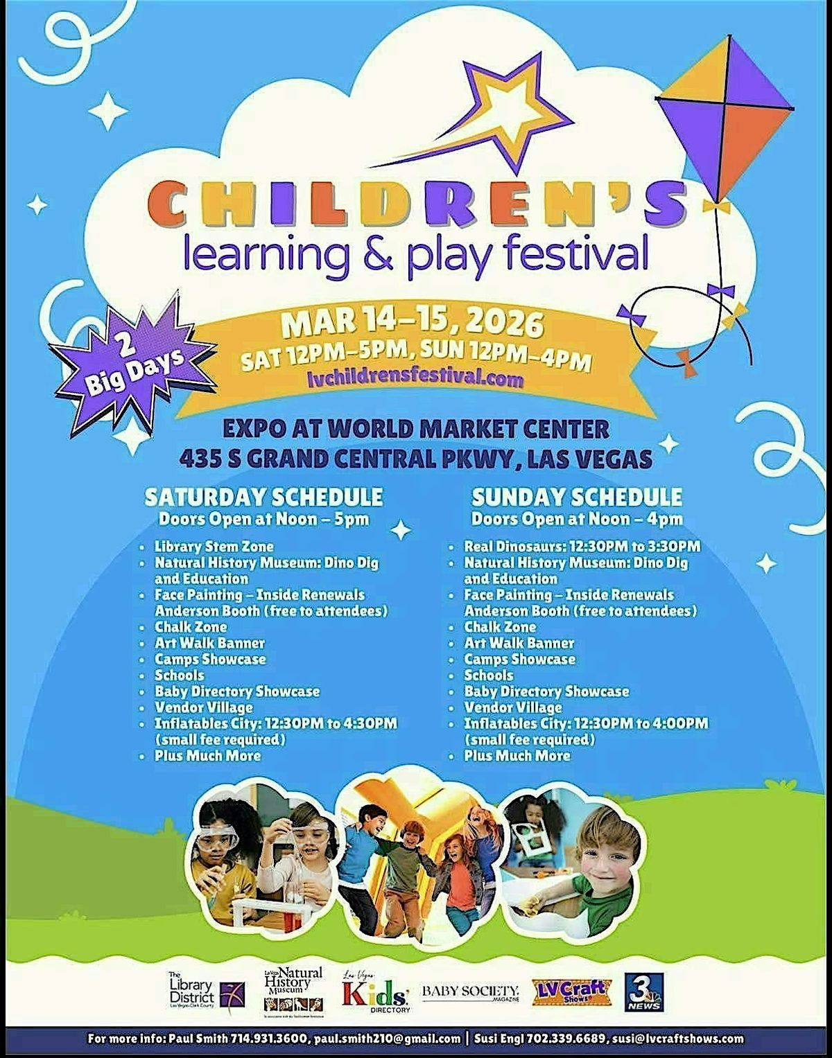 Bring the kids to the two day LV's Children's Learning & Play Festival - March 14th from noon-5pm and March 15th noon -4pm at the Expo World Market Center Las Vegas. Parents, come learn about resources and programs available for families. Bring the kids to experience fun and new activities. Details to follow.