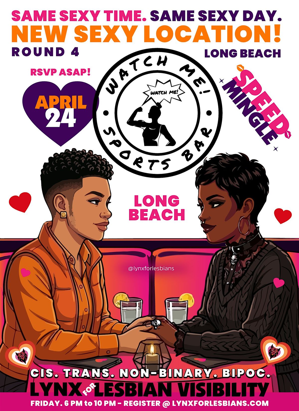 This is a private, BIPOC-organized and focused speed mingling event embracing womxn, butches, femmes, mascs, trans, two-spirit, non-binary, and all gender-expansive members of the lesbian community.
