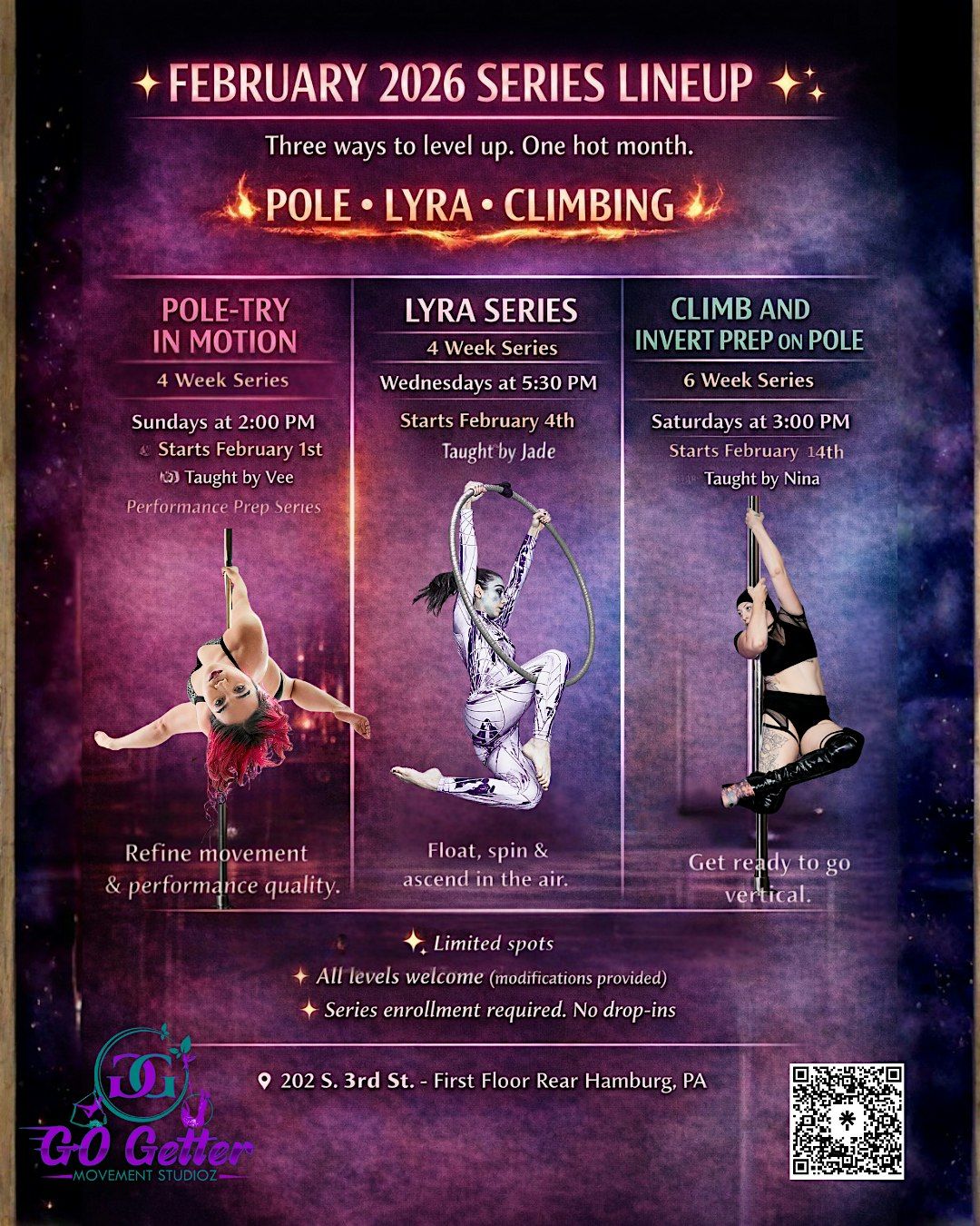February at GGMS is all about leveling up.We are bringing you three focused series designed to build strength, control, and confidence—whether you are refining performance quality, taking flight on lyra, or preparing to go vertical or upside down on the pole, we have you covered.