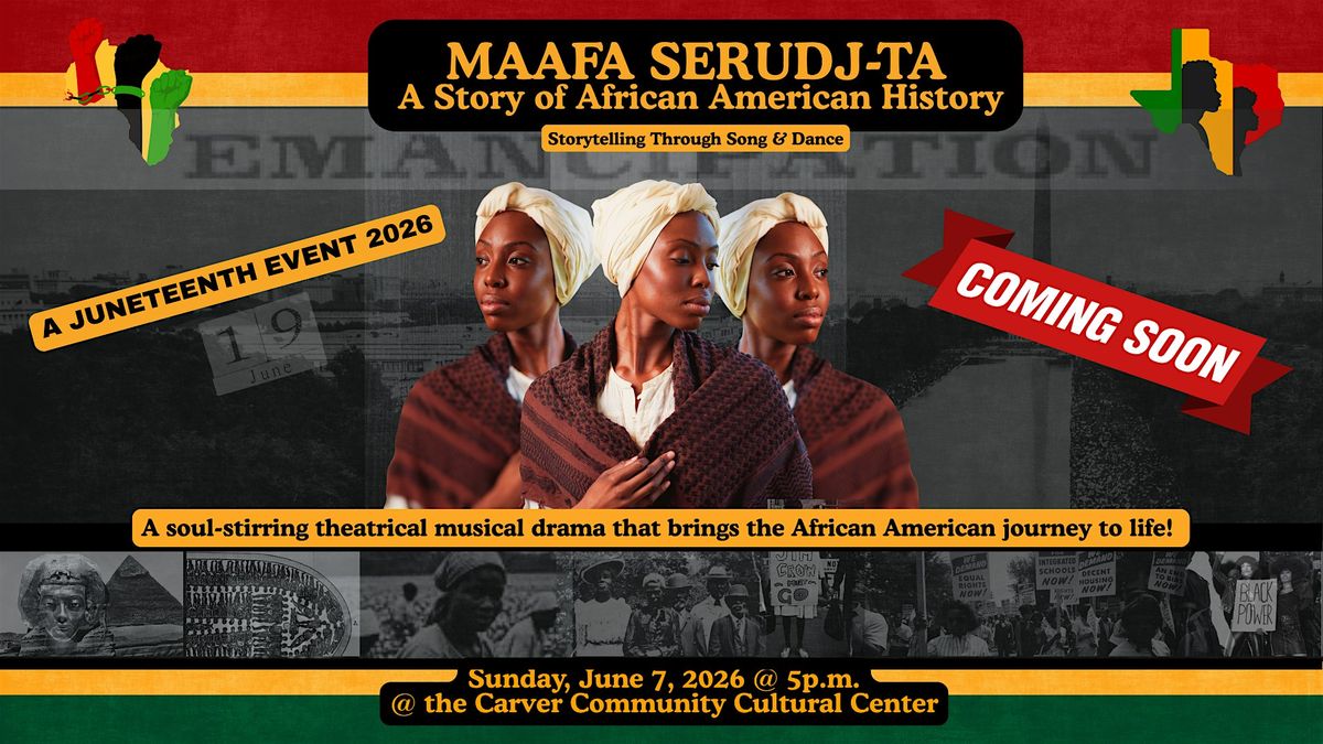 In honor of Juneteenth, the Pan African Cultural Community presents MAAFA SERUDJ-TA: A Story of African American History—a powerful theatrical-musical production tracing the journey of African people from Africa to America; from civilization and humanity, through the Maafa and slavery, to resistance, identity, and restoration.