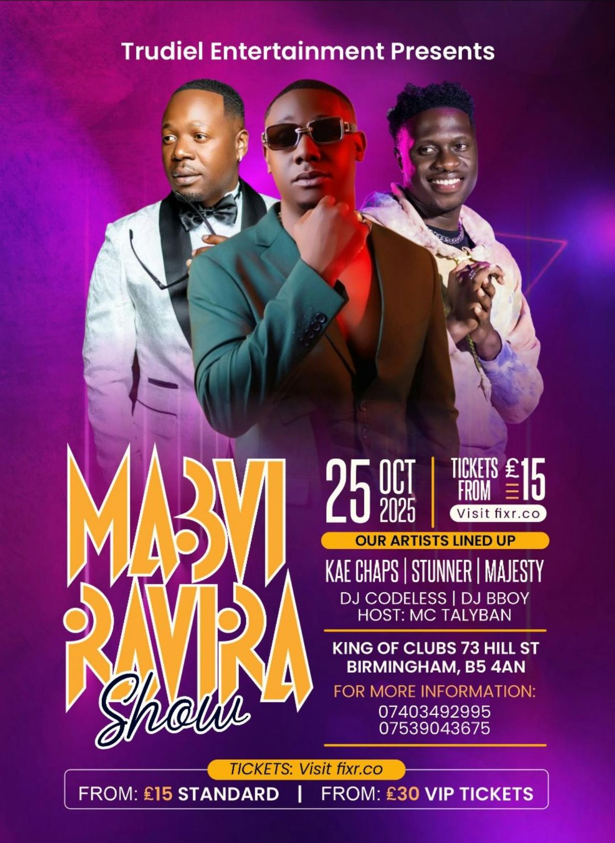 Mabviravira Show – a night of unforgettable music, energy, and vibes in the heart of Birmingham.This exclusive event brings together some of the hottest talents for an electrifying live performance that will keep you on your feet all night.