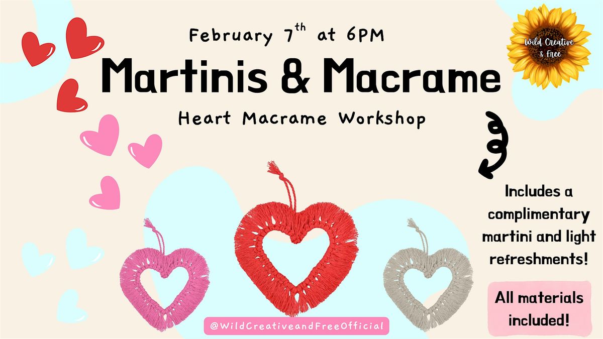 Come join us for a fun-filled evening of macrame and martinis at our Valentine's Day Edition workshop! Let's get crafty and create beautiful heart-shaped macrame designs while sipping on delicious martinis. No experience necessary - our talented instructors will guide you every step of the way. It's the perfect way to celebrate the season of love with friends or a special someone. Don't miss out on this unique and creative event!