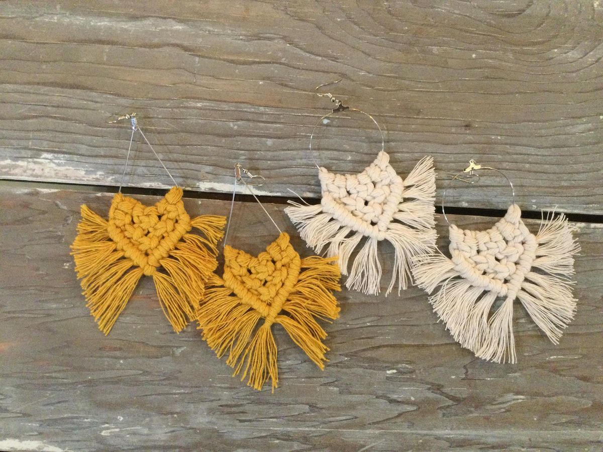 This class is for the intermediate macrame DIYer. You will learn how to make your own on trend macrame earrings. Everything to complete two pairs of earrings will be provided there will be choices of different shapes and various colors to choose from. Price includes wine and there will be a 10% off discount on shopping day of class