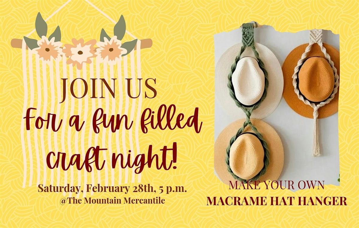 Welcome to Macrame Hat Hanger Craft Class at The Mountain Mercantile! Join us on March 7th, 2026 at 5:00 PM for a fun and creative session. Learn how to make your own stylish hat hanger using macrame techniques. No experience needed, just bring your enthusiasm! Don't miss out on this opportunity to create something unique and beautiful. See you there!