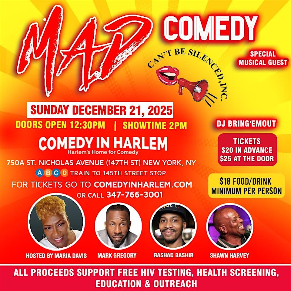 Join us in person for an Afternoon full of laughs and good vibes at MAD COMEDY! This event promises a hilarious lineup that'll have you rolling in your seat. Whether you're coming with friends or flying solo, expect an upbeat atmosphere and side-splitting jokes. Don't miss out on the fun — come experience the madness live and make some awesome memories!